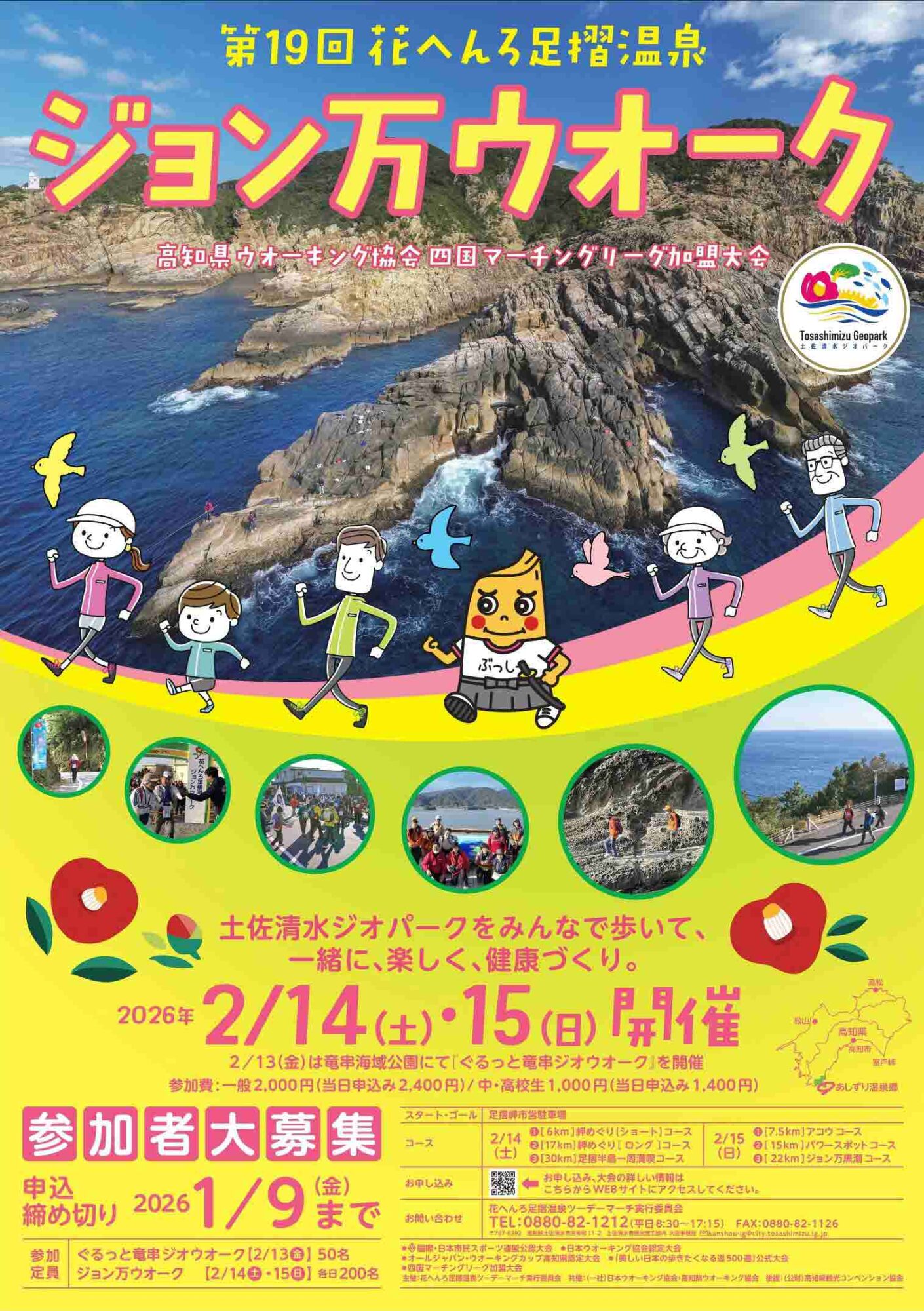 遍路道や遊歩道、唐人駄場など自然が豊かに残る見どころ満載の足摺半島を、一緒に楽しくウォーキングをする大会です。