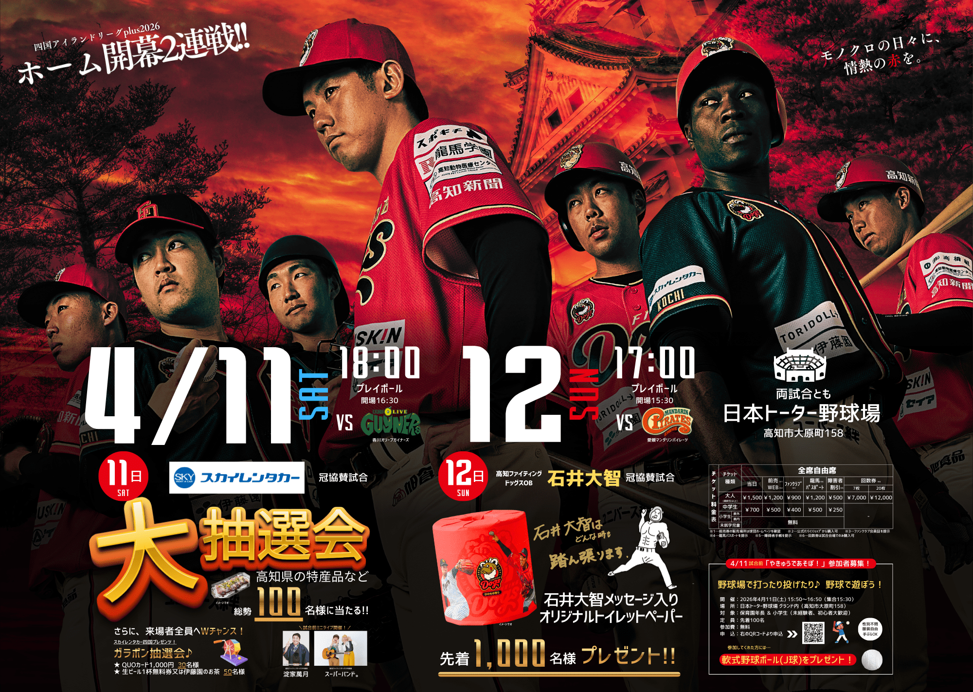 12日は高知ファイティングドッグスOBの石井大智選手のメッセージ入りトイレットペーパーを先着1,000名様にプレゼント。