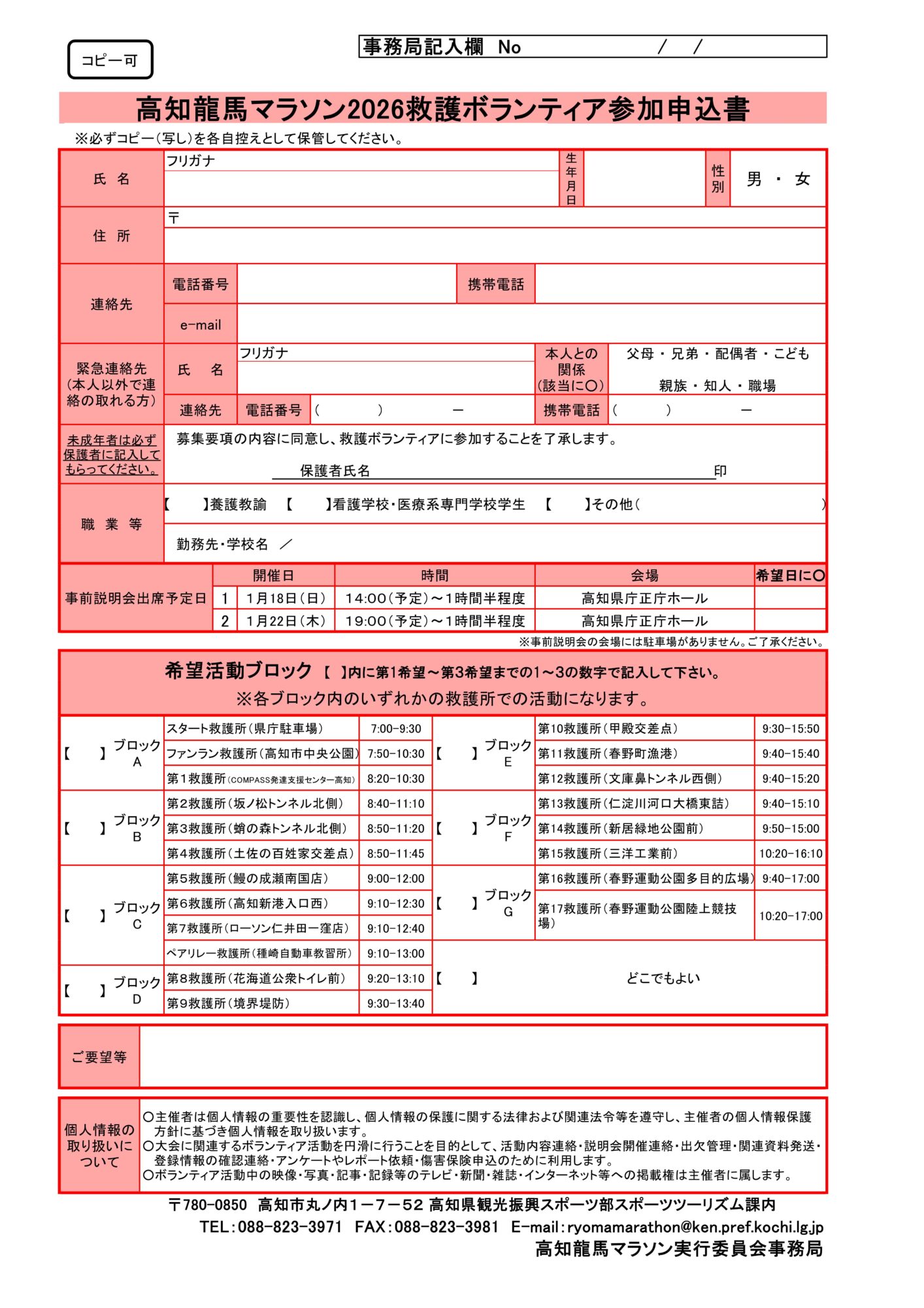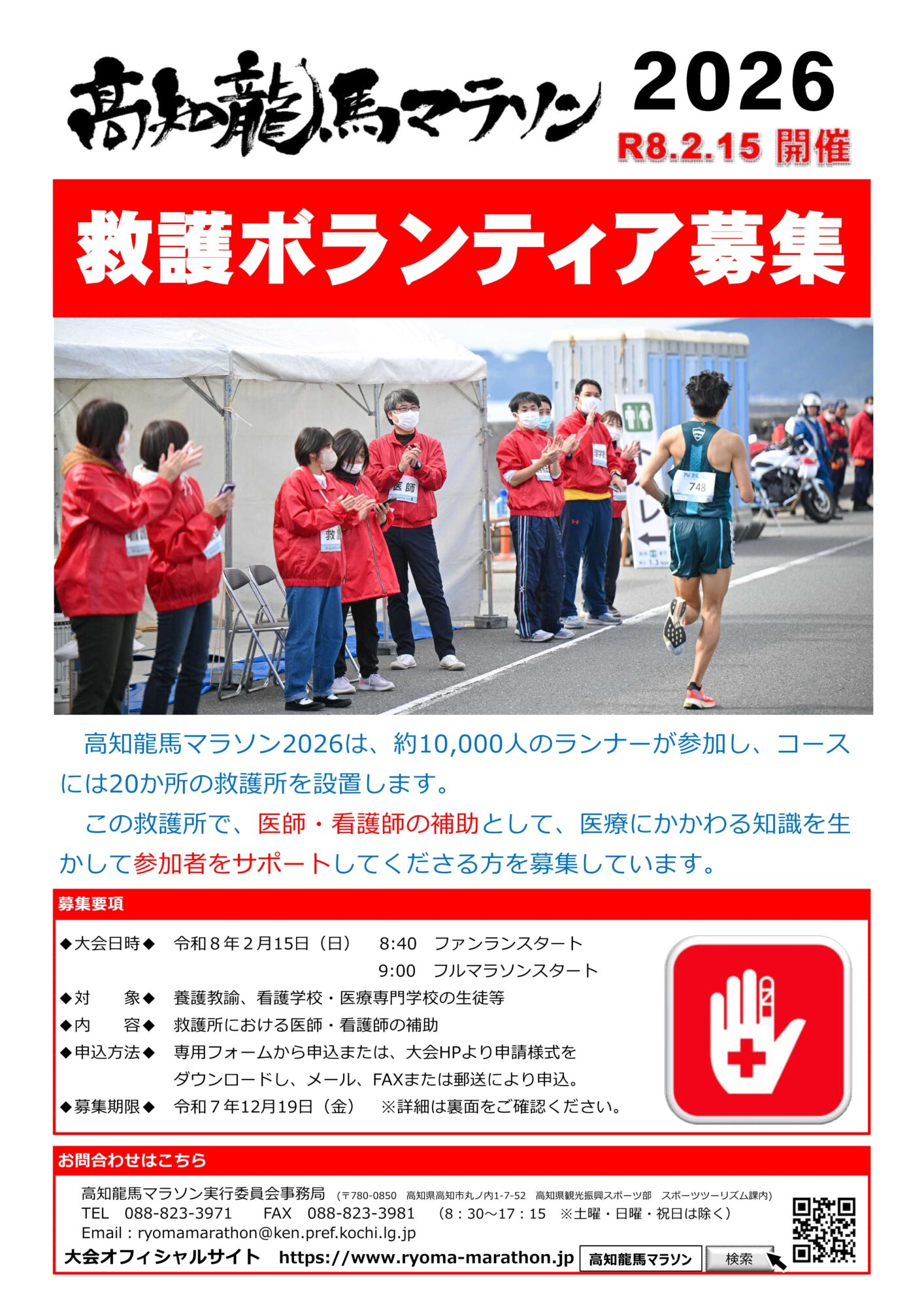 来年2月15日(日)に開催される当大会は、約10,000人のランナーが参加し、コースには20か所の救護所を設置します。この救護所で、医師・看護師の補助として、医療にかかわる知識を生かして参加者をサポートしてくださる方を募集しています。