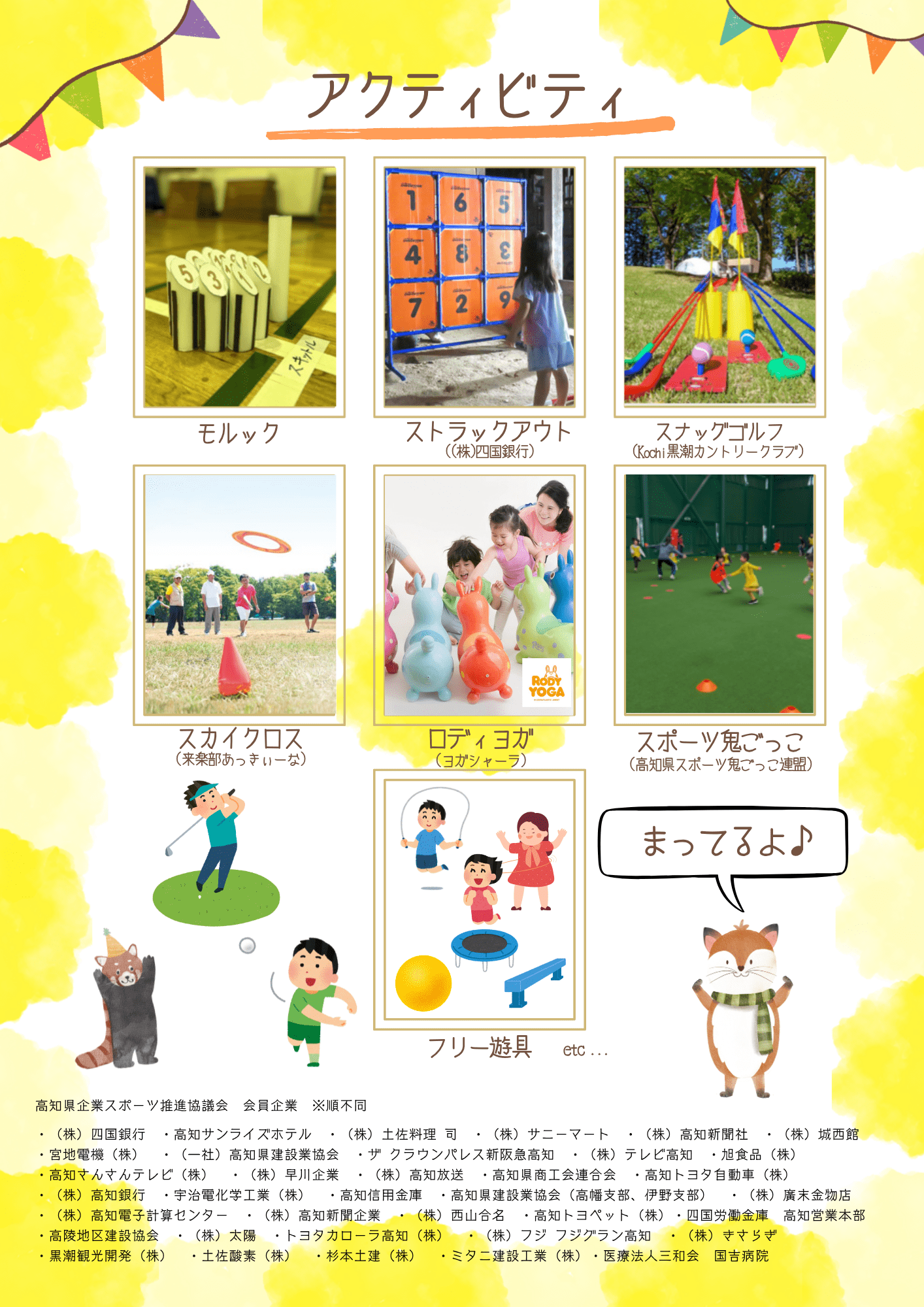 当日は「ストラックアウト」「スナッグゴルフ」「スポーツ鬼ごっこ」や、かわいいロディを使ったヨガ「ロディヨガ」の他、「スカイクロス」や「モルック」等の楽しいプログラムがもりだくさん!ぜひお越しください。