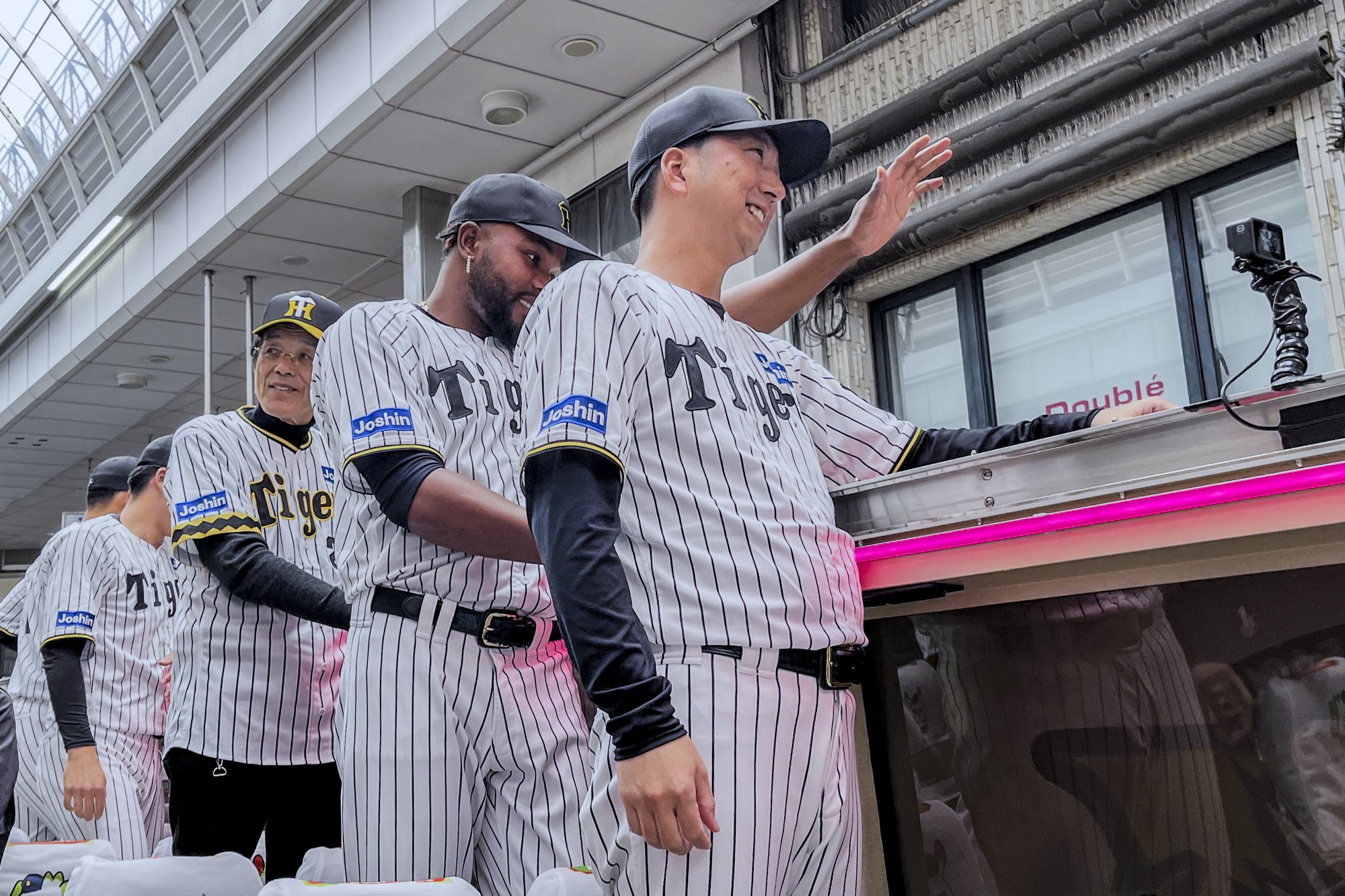 オープンバスの上では、藤川監督が笑顔で手を振り、石井投手が帽子を掲げて応える。