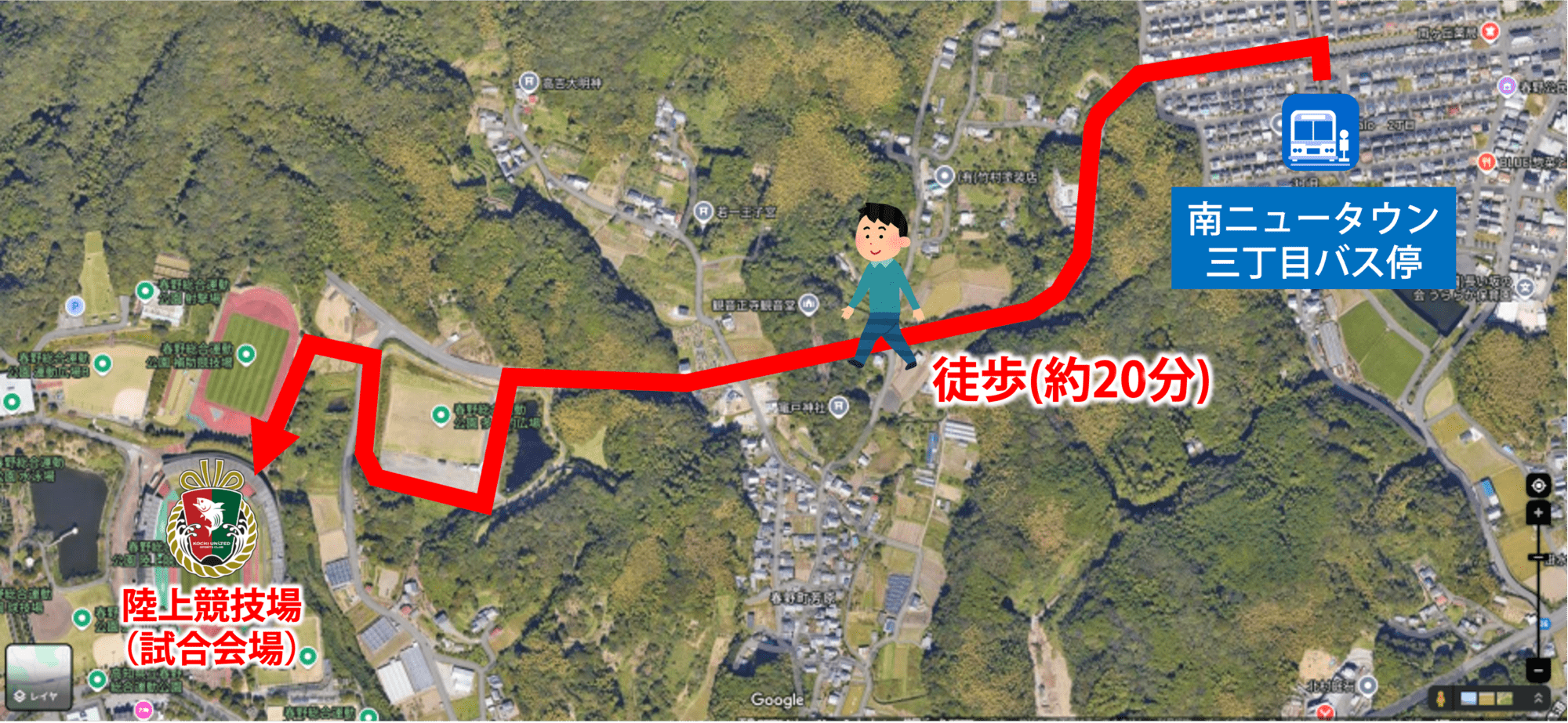 ②はりまや橋バスターミナルからは、「南はりまや橋バス停」から路線バスを利用して「南ニュータウン三丁目バス停」で下車(約25分)、徒歩でGIKENスタジアムへ(徒歩約20分)