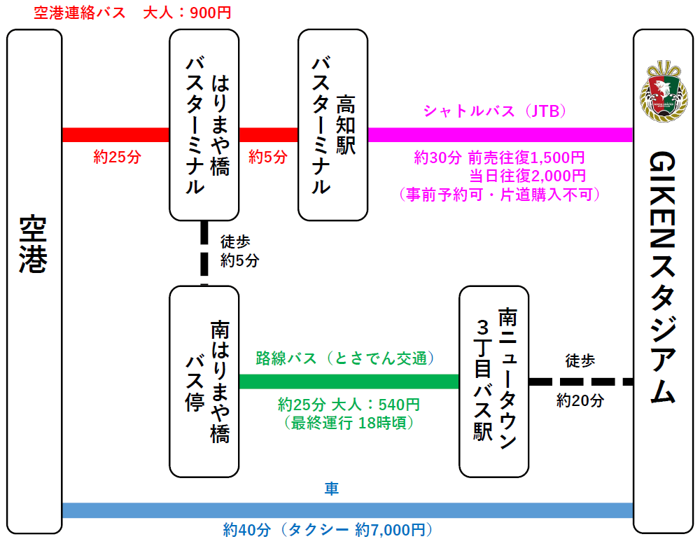 高知龍馬空港からGIKENスタジアムまでは、以下の方法でアクセス可能です。