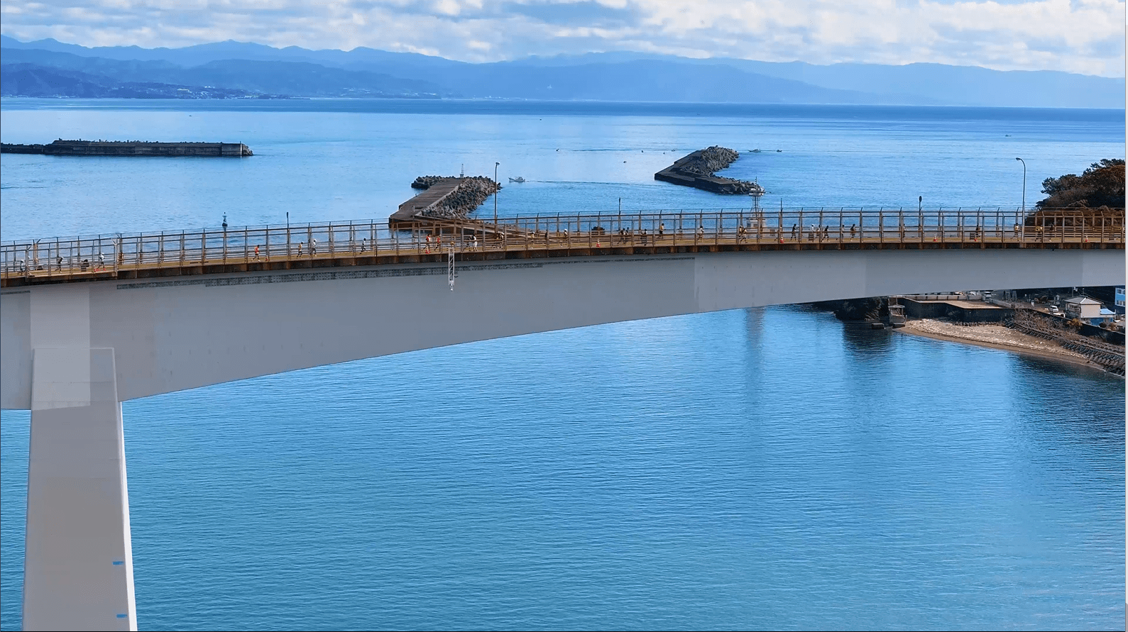 浦戸大橋から、浦戸湾とその先に広がる太平洋の景色を眺めながら、ランナーに声援を送れる絶景スポットです。