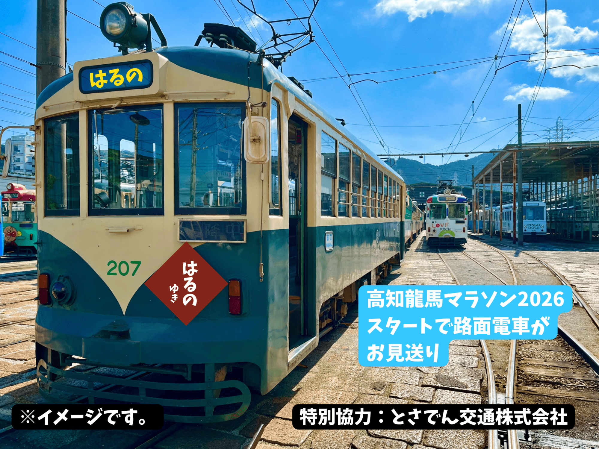 路面電車がランナーをお見送り